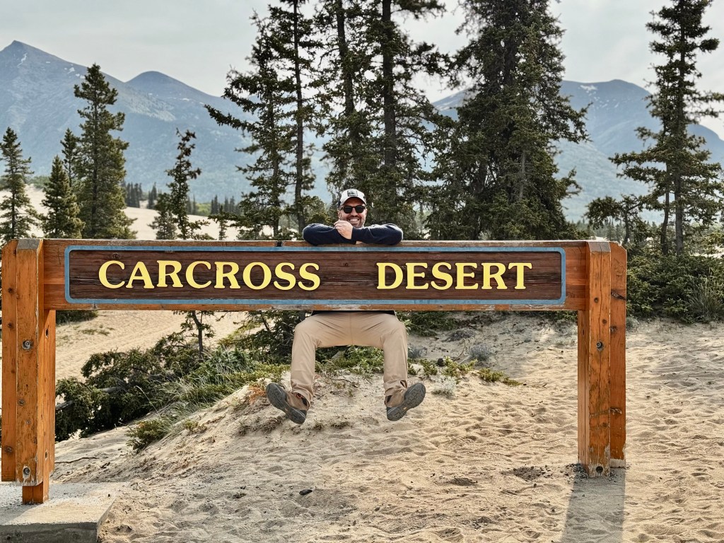 Au matin, premier véritable contact avec le territoire : le désert de Carcross, surnommé « le plus petit désert du monde ». En réalité, il s’agit d’anciennes dunes glaciaires, vestiges du lac glaciaire Watson. Un paysage aride, étonnant, posé au cœur des montagnes et des forêts — comme une anomalie géographique.